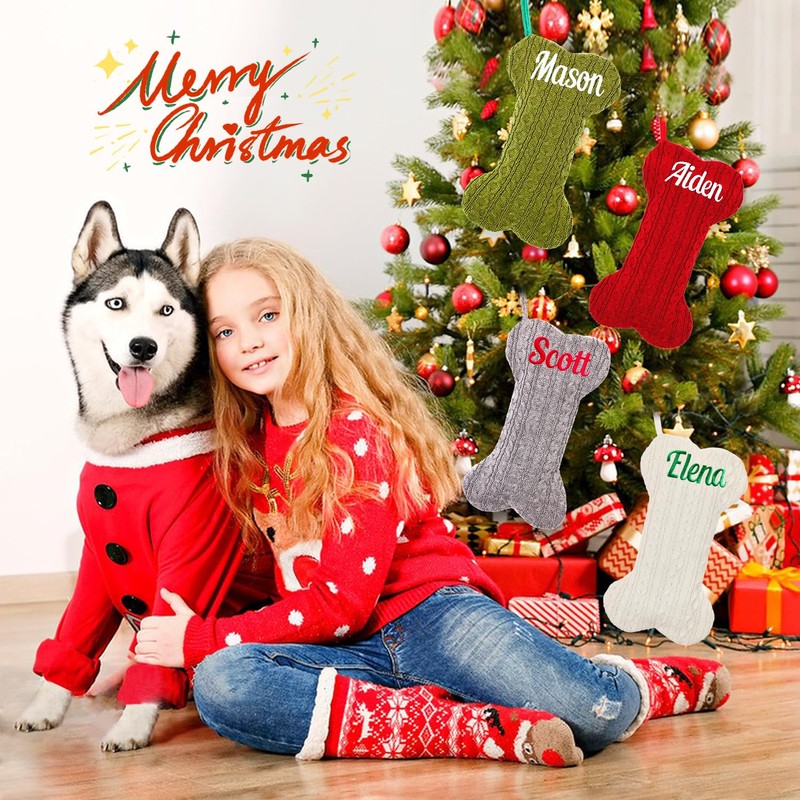 CRSTAFU 1Pc Personalized Dog Christmas Stockings, Custom Embroidered Name Pet Dog Stockings Christmas, Family Knitted Bone Xmas Stocking with Name for Dogs