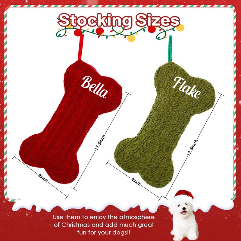 • 【Quality Xmas Stockings】Bone shape Christmas stockings size with 17.5" long, 8" width.These personalized christmas stockings are large enough to hold many small toys, candies, baubles and gifts for your pets.