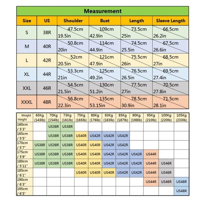 - Size reference: S≈38R, M≈40R, L≈42R, XL≈44R, XXL≈46R, 3XL≈48R