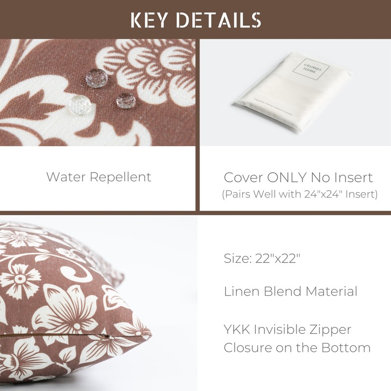 Crumbs Home Modern Farmhouse Fall Linen Indoor Outdoor Throw Pillow Cover Only, 22"x22" Water Repellent for Patio, Backyard, Couch, Cocoa Brown Neutral Floral