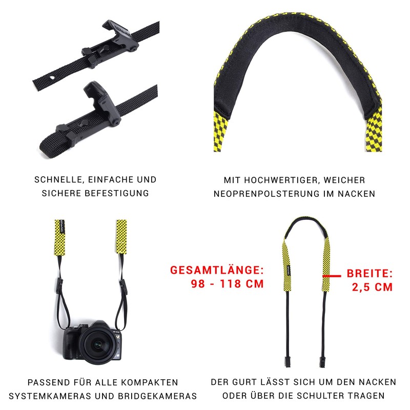 - Universally applicable, the check strap carrying strap fits all compact system cameras and bridge cameras, regardless of type or brand. The camera only needs the usual hanging eyelets for our loops