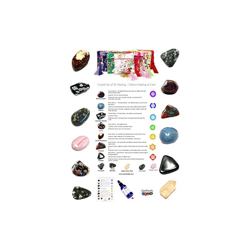 - The exact 11 crystals you will receive are the following: Botswana Agate, Angelite, Snowflake Obsidian, Que Sera, Lemon Chrysoprase, Seftonite, Shungite, Tree Agate, Preseli Bluestone, Heena Jasper, Mangano Calcite.