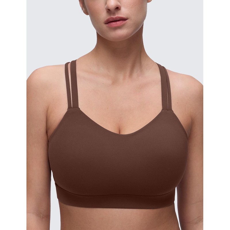 CRZ YOGA Softness Mold Womens Butterluxe U Neck Longline Sports Bras - Supportive Cross Back Double Strap Yoga Top D/DD Cup Coffee Brown Large