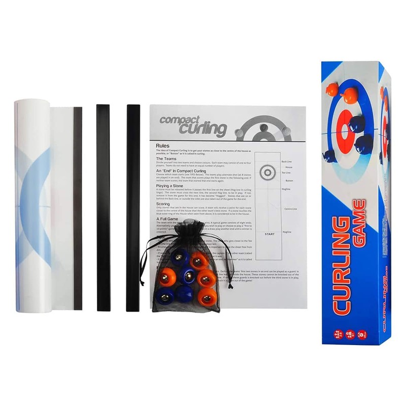 - This curling board game is easy to carry and set up. Just find a smooth surface and open the box in a few seconds, then you can start your fun time. Includes: 1 x rolling mat, 2 x magnetic strips, 10 stones in blue and orange, 1 x English manual.