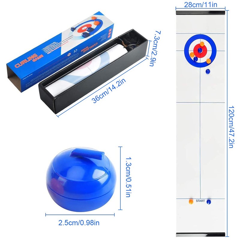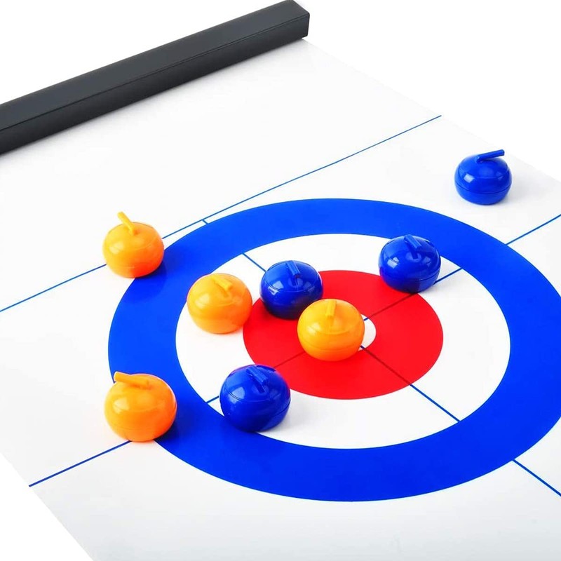 - This is such a beautiful, compact travel game for children, takes up no space at all and contains a shiny rollout surface with a length of 47.2 inches and 5 blue and 5 orange ice hockey games. With the lightweight tabletop curling game, you can transport the fun wherever you go!