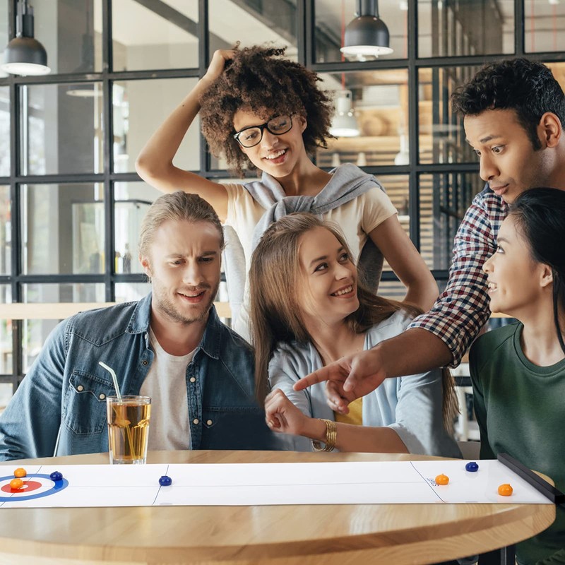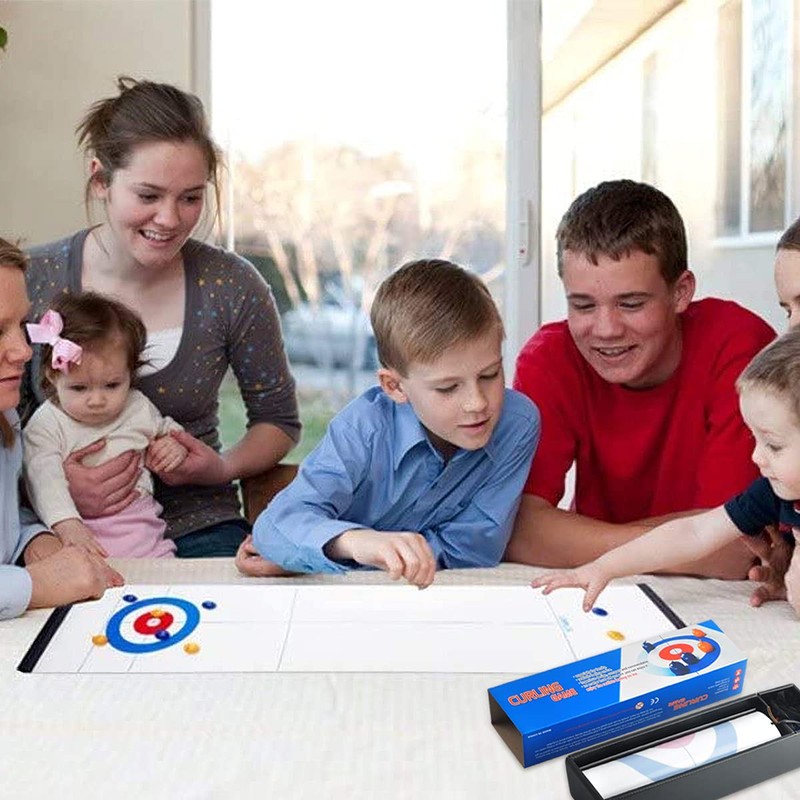 - Tabletop curling is suitable for the family. You will find that challenging each other is a very interesting game between adults and teenagers. Children play this for hours when they get a feel for it. You can relax and relieve pressure by playing it with friends