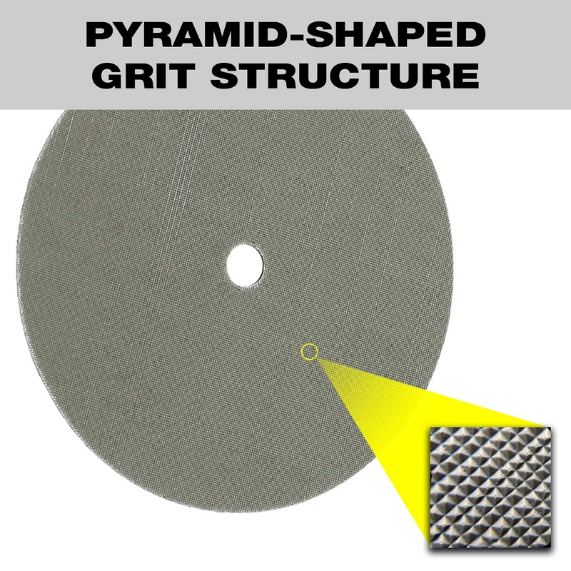 - New abrasive fabric with pyramid-shaped grit structure for high material removal while producing a very fine finish