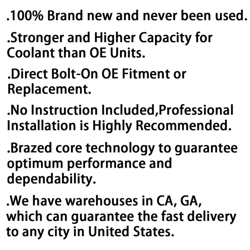 This all-aluminum radiator provides maximum cooling efficiency and prevents premature engine failure. The advantages that are heat transfer aluminum using tube and fin design can significantly increase the heat surface area, so that heat more efficient dissipation. It's built tough for improved reliability, airflow, and cooling.
