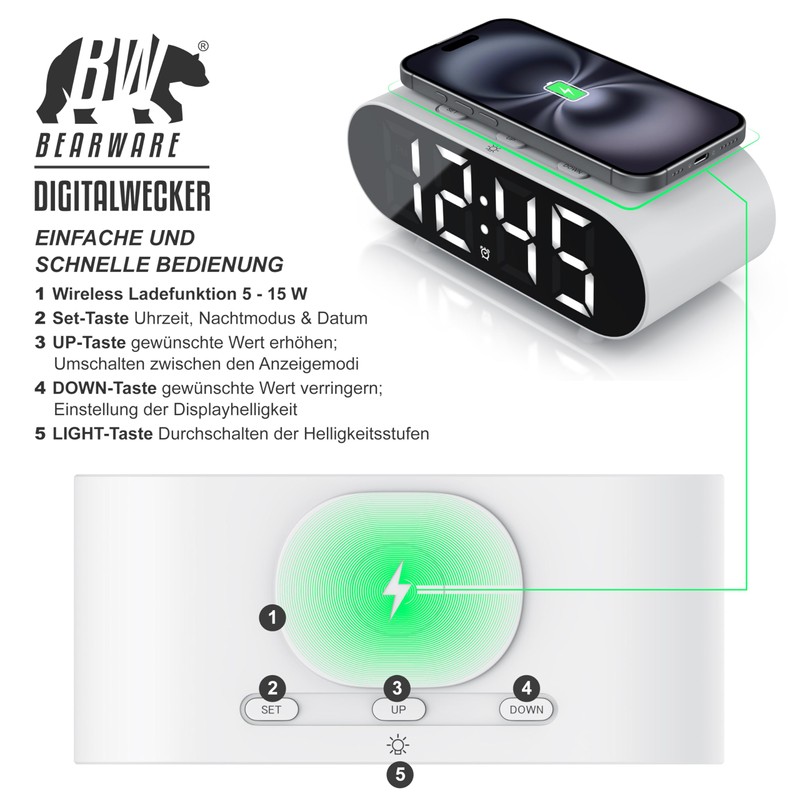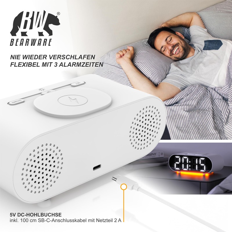 - The perfect start to the day: the innovative alarm clock from Bearware combines comfort, functionality and modern technology in a compact design. With date and time display, 3 alarm times, energy-saving mode with acoustic control and the practical wireless function: charge your QI-enabled smartphone comfortably and wirelessly via the integrated charging pad – without tangled cables on the bedside table. | 307287