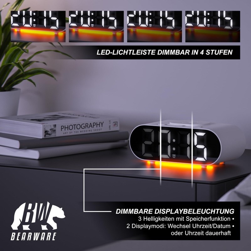 - DIMMABLE DISPLAY LIGHTING WITH MEMORY FUNCTION. Customizable: Adjust the brightness of the display to suit your preferences – e.g. bright in the day or soft in the dark. Your settings will be saved permanently. Two display modes to choose from. In M1 mode, the display automatically switches between time and date. With M2, the alarm clock shows you the time permanently. With orange LED light bar for feel-good atmosphere, dimmable.