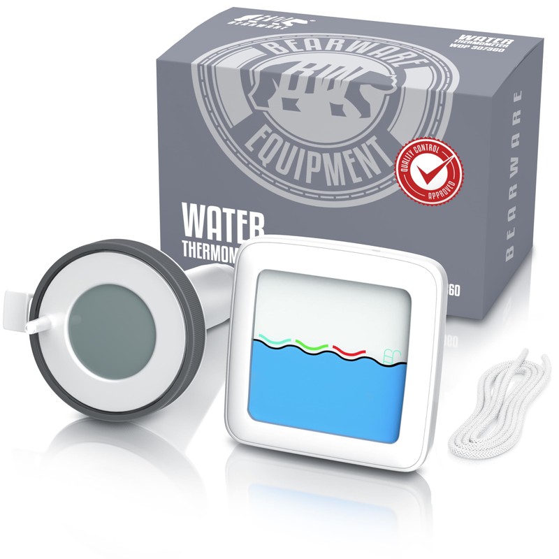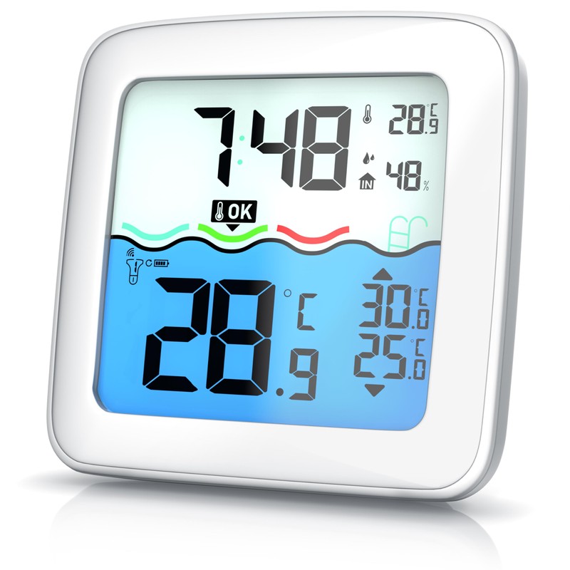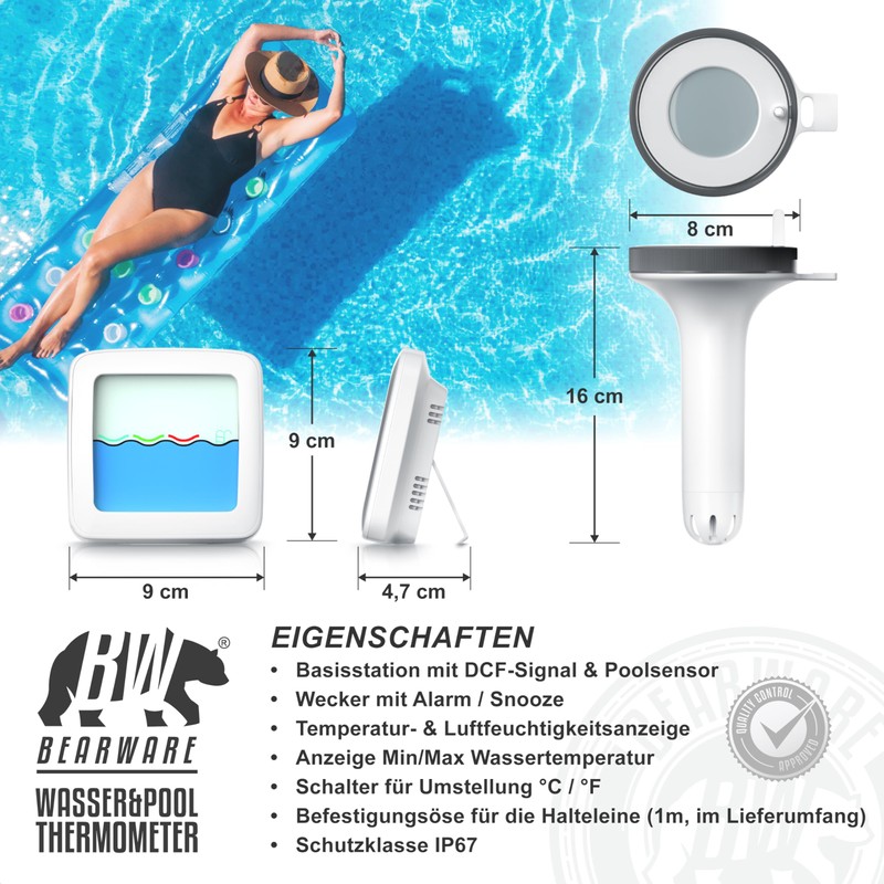 - The high-quality bearware thermometer set allows reliable monitoring of the water temperature via a floating outdoor sensor. It accurately measures the temperature of your pool, hot tub or pond and transmits the data to the base station by radio. This shows not only the water temperature, but also the room temperature and humidity. In addition, the integrated radio clock with DCF transmission ensures an exact time and also offers an alarm function with snooze. |307360