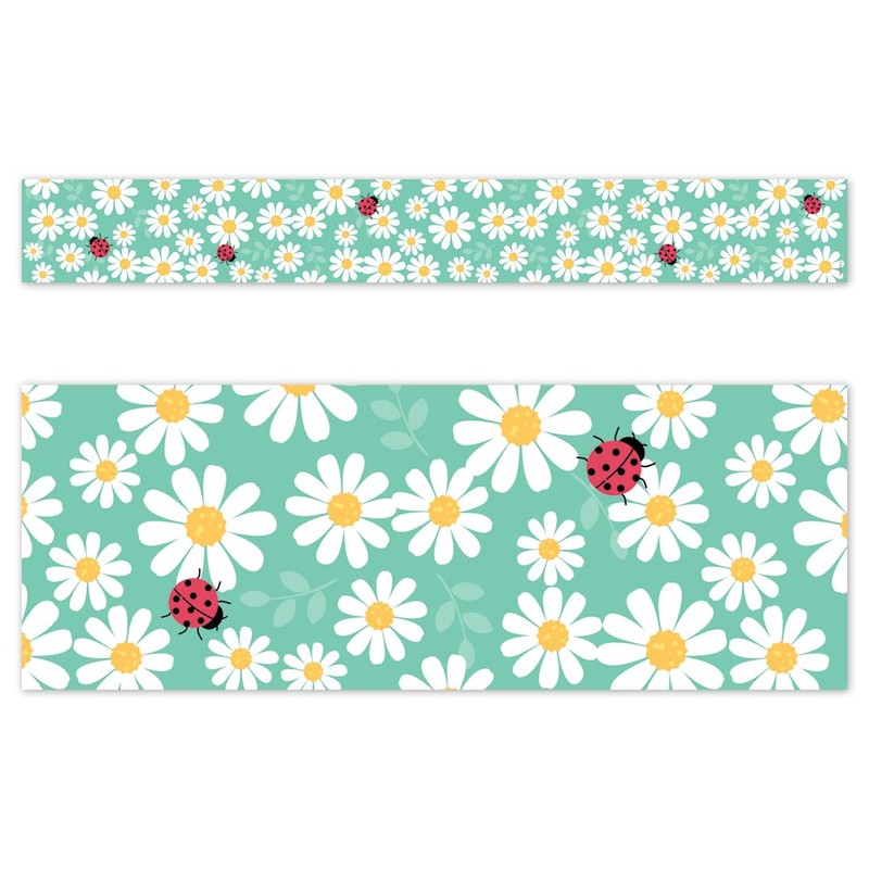 - FRESH FLORAL DESIGN Ð This borderÕs daisies and ladybugs on a teal background will add a fresh breath of spring to brighten bulletin boards any time of year.ÊÊÊÊ