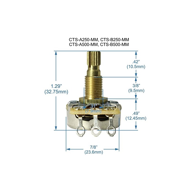 Metric version of the famous CTS pots! Now you can replace your original metric pots with quality CTS brand pots. No need to replace the knobs or make larger mounting holes to fit these CTS pots.