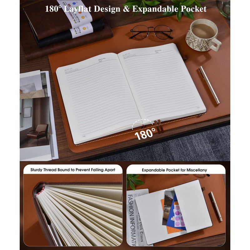 - Cuaderno de diario forrado mejorado: el diseño plano de 180°, combinado con una encuadernación resistente con rosca, el cuaderno de piel se puede colocar fácilmente plano hace que tomar notas sea más eficiente. Cada diario viene con 2 exquisitas cintas para marcadores. Y 1 banda de cierre elástico para mantener tus páginas seguras. 1 soporte para bolígrafo para que tu bolígrafo ya no esté solo. 1 bolsillo interior trasero para guardar notas, etc. El diseño de esquina redondeada hace que el cuaderno forrado no se dañe ni se rique fácilmente.