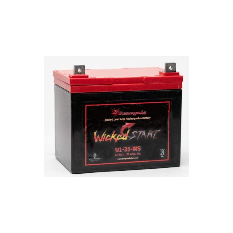 12 Volt, 35 Amp Rechargeable Sealed Lead Acid Battery Part number: U1-35-WS Terminal= Nut & Bolt Terminals 400+ Cold Cranking Amps Dimensions: 7.80" Length x 5.20" Width x 6.22" Height (7.00" Height over terminals) Weight: 25 lbs Absorbent Glass Mat (AGM) technology for superior performance Valve regulated, spill proof construction allows safe operation in any position Power/volume ratio yielding unrivaled energy density Rugged impact resistant ABS case and cover (UL94-HB) Integrated ABS carrying handle for ease of movement Approved for transport by air. D.O.T., I.A.T.A., F.A.A. and C.A.B. certified U.L. recognized under file number MH 60882 Ready to go out of the box Completely sealed, non-spillable No Acid filling Our batteries feature AGM construction. AGM stands for Absorbed Glass Mat; this is the latest technology in battery production today. AGM construction gives you a completely sealed liquid-free battery which will not leak or corrode. AS WITH ALL RECHARGEABLE BATTERIES, THIS BATTERY MUST BE PROPERLY CARED FOR. PLEASE USE THE FOLLOWING GUIDE LINES: WHEN NOT IN USE, THIS BATTERY MUST BE CHARGED EVERY 3 MONTHS. MORE OFTEN IF USED IN VEHICLES EQUIPPED WITH SECURITY ALARMS. AN AUTOMATIC BATTERY CHARGER OR FLOAT TYPE CHARGER, NO GREATER THAN 1.5 AMP SHOULD BE USED. CHECK THE TERMINALS FOR CLEANLINESS AND LOOSE CONNECTIONS. STORAGE OF THE BATTERY SHOULD BE BETWEEN 62 & 82 DEGREES FAHRENHEIT. THIS IS A SEALED BATTERY AND SHOULD NEVER BE OPENED OR TAMPERED WITH. FAILURE TO ADHERE TO THESE GUIDELINES, WILL SHORTEN THE LIFE EXPECTANCY OF THE BATTERY. Only the batteries are shipped with your order. Existing cables and connectors must be re-used.
