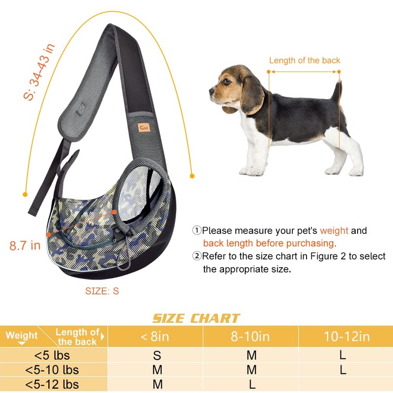 - 🐕【2 Size for Select】- CUBY mesh puppy sling comes in 2 size, S, L for your choice. Please refer to the size chart, measure your pet's weight and size to find the best size for your four-leg friend. And there is a storage pocket front it for your personal items or treats for your pooch.