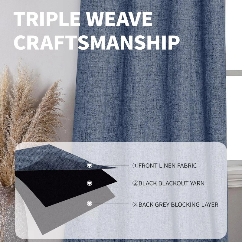 - 100% Full Blackout Curtain and Good Sleep: Made of faux linen textured blackout curtains with coating on the back, Innovative triple woven textured fabric blocks out 100% light and UV rays. keep the room total dark and the sunshine doesn't come in anymore.you can have a good rest and late sleep,suitable for shift workers, seniors, infants,and computer operators
