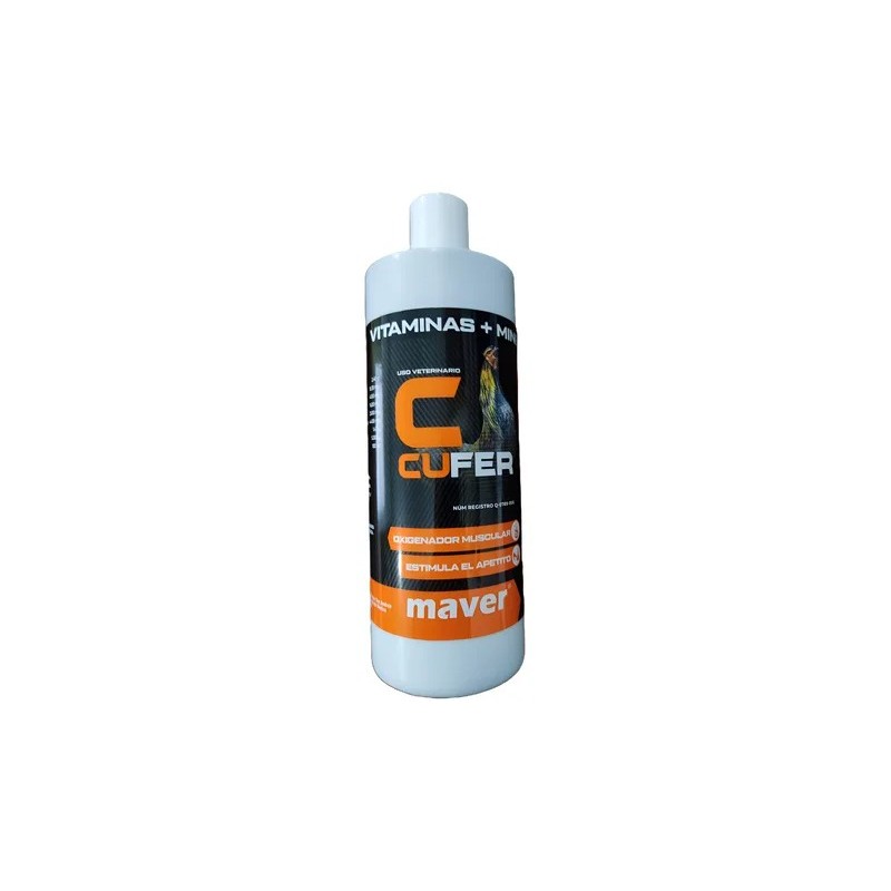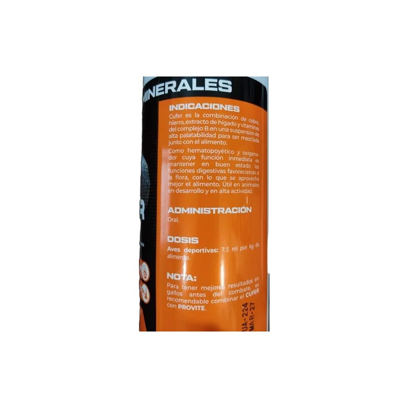 Descripción Limpia: Cufer es la combinación de cobre, hierro, extracto de hígado y vitaminas del complejo B en una suspensión de alta palatabilidad para ser mezclada junto con el alimento.