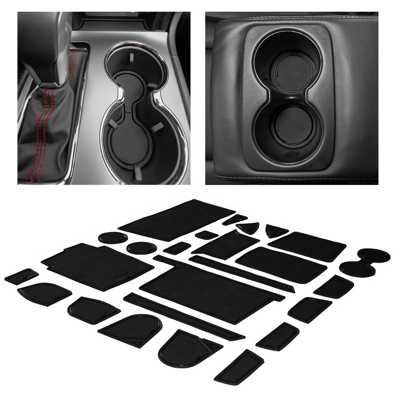 - Smart Craftsmanship: Engineered in America, we spared no expense or brilliant concept to ensure this non-slip mat set delivers excellent protection & peace of mind. We kept the design simple—no busy logos or messages—just a tasteful stripe in your choice of colors on clean black high-grip rubber. Put the custom-sized pieces in your cup holders, door pocket areas, and center console tray, then enjoy the handsome look and stay-put functionality.