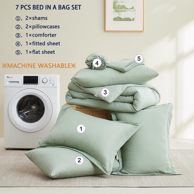 - 7 pieces Sage Green Queen Comforter Set: Bed in a bag comforters queen size set, including 1 Comforter (90" x 90"), 2 Pillowcases (20" x 30"), 2 Pillow Shams (20" x 26" ), 1 Fitted Sheet (60" x 80" + 14"), 1 Flat Sheet (90" x 102"), Whether it's for Mother's Day, Christmas, or just to show you care, it can be given as a gift to your loved ones!