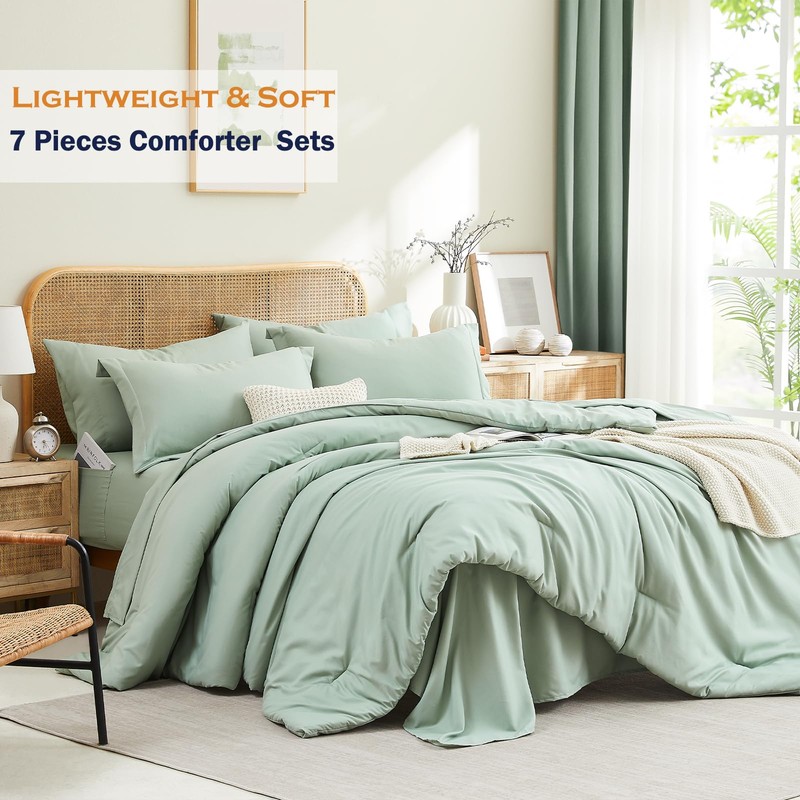 Cupocupa Queen Comforter Set with Sheets,Sage Green 7 Pieces Bed in a Bag Comforters Queen Size Set for Bedroom; Bedding Comforter Set, Flat Sheet, Fitted Sheet, Pillowcases and Pillow Shams