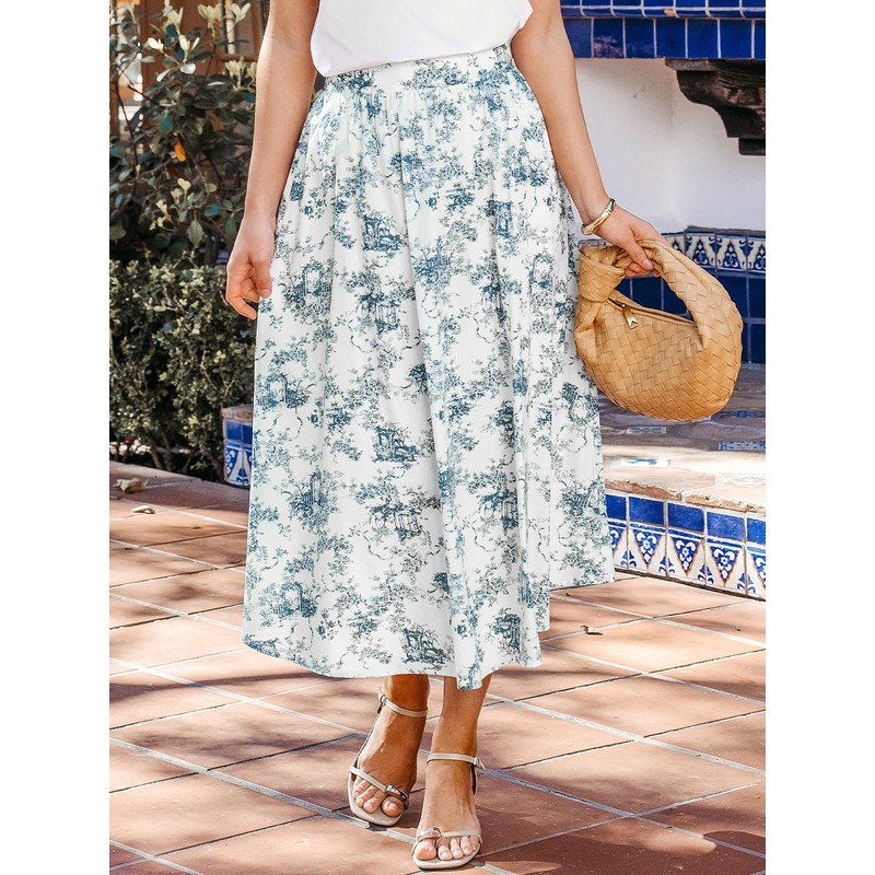 CUPSHE Women's Cotton High Waist French Landscape Toile Maxi Skirt, Blue floral design, S