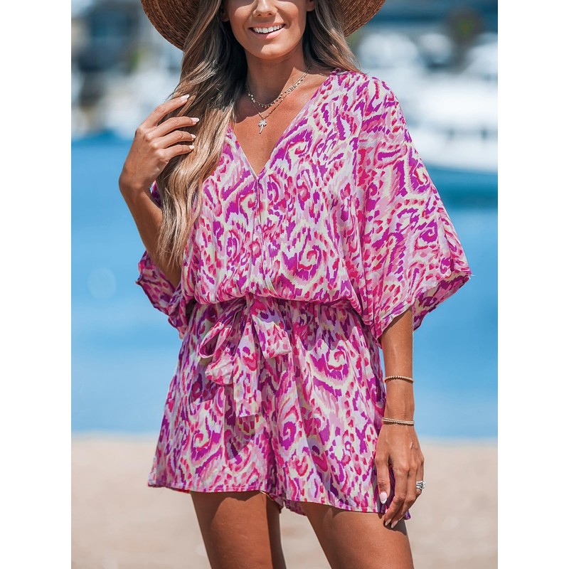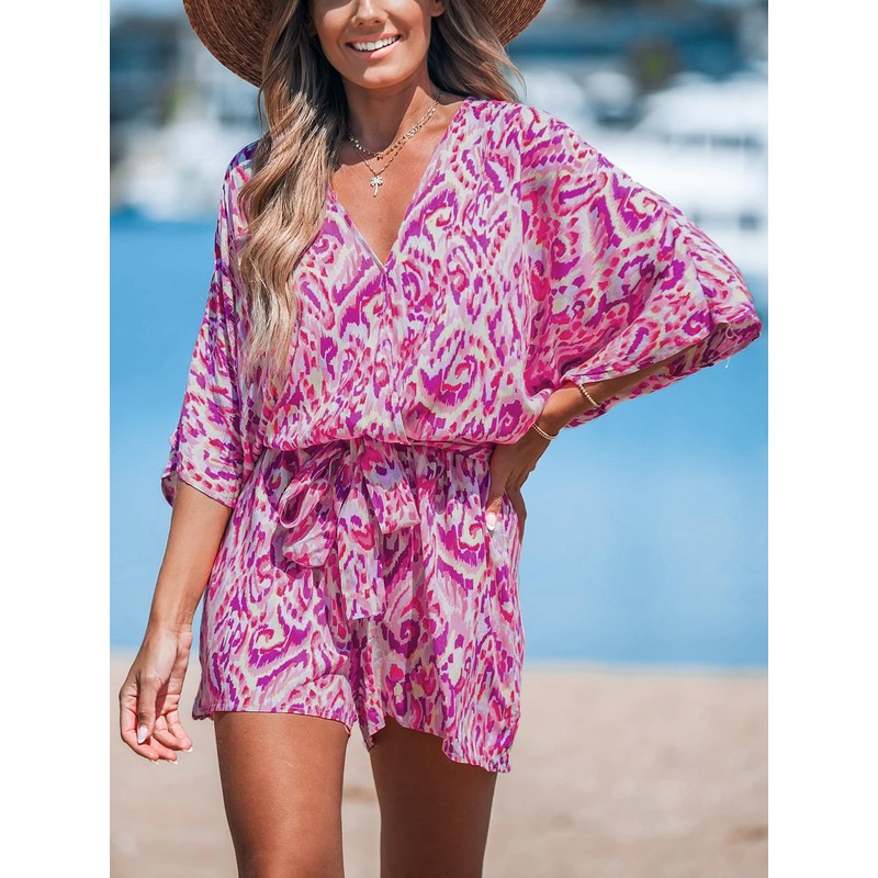 CUPSHE Women's Summer Romper Abstract Print V Neck 3/4 Sleeve Loose Drawstring Mini Jumpsuit Wide Leg Outfit Fuchsia, XL