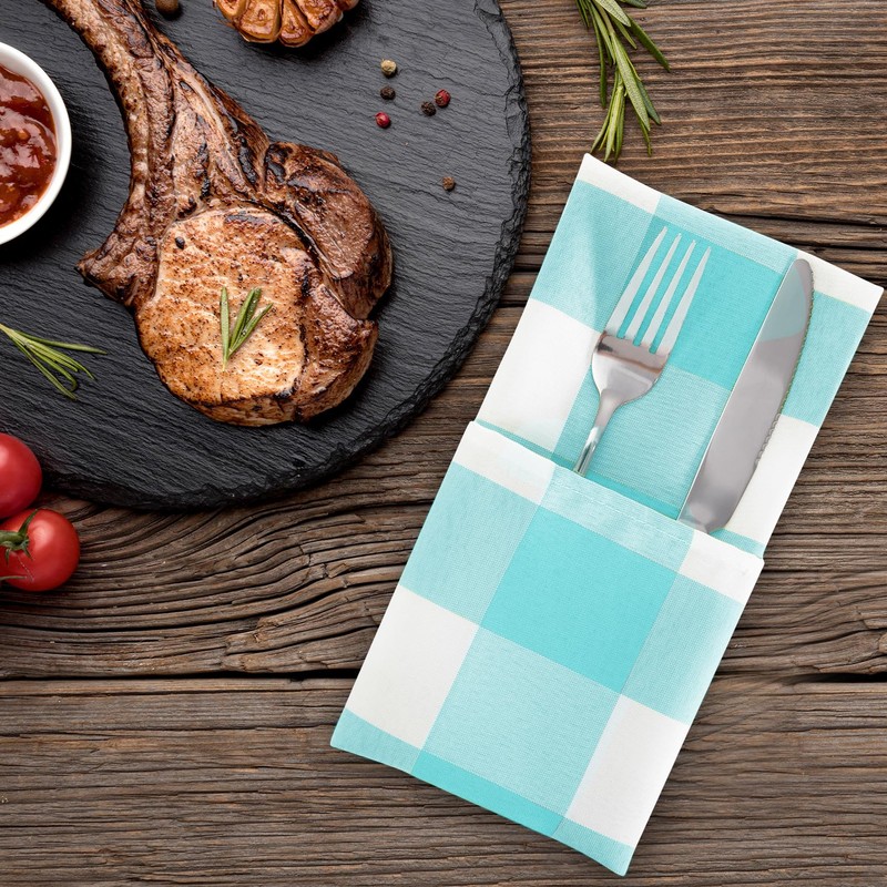 Cupuamon Buffalo Plaid Table Napkins Set of 100, 17x17 inch, Aqua and White, Polycotton Blend, Plaid Pattern
