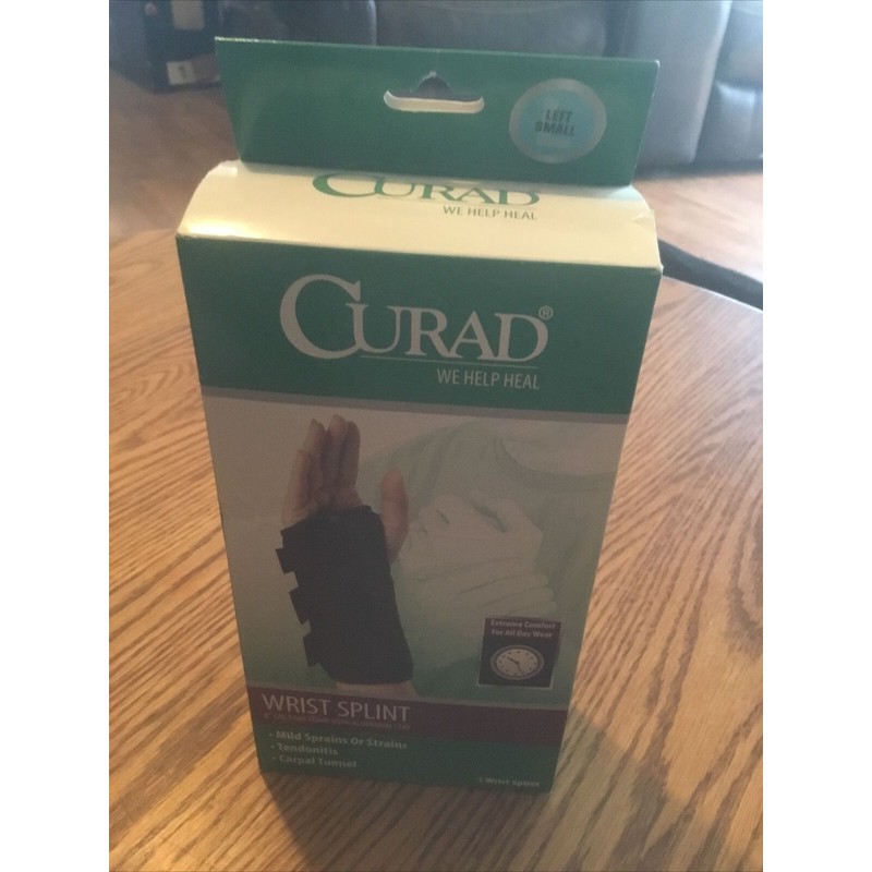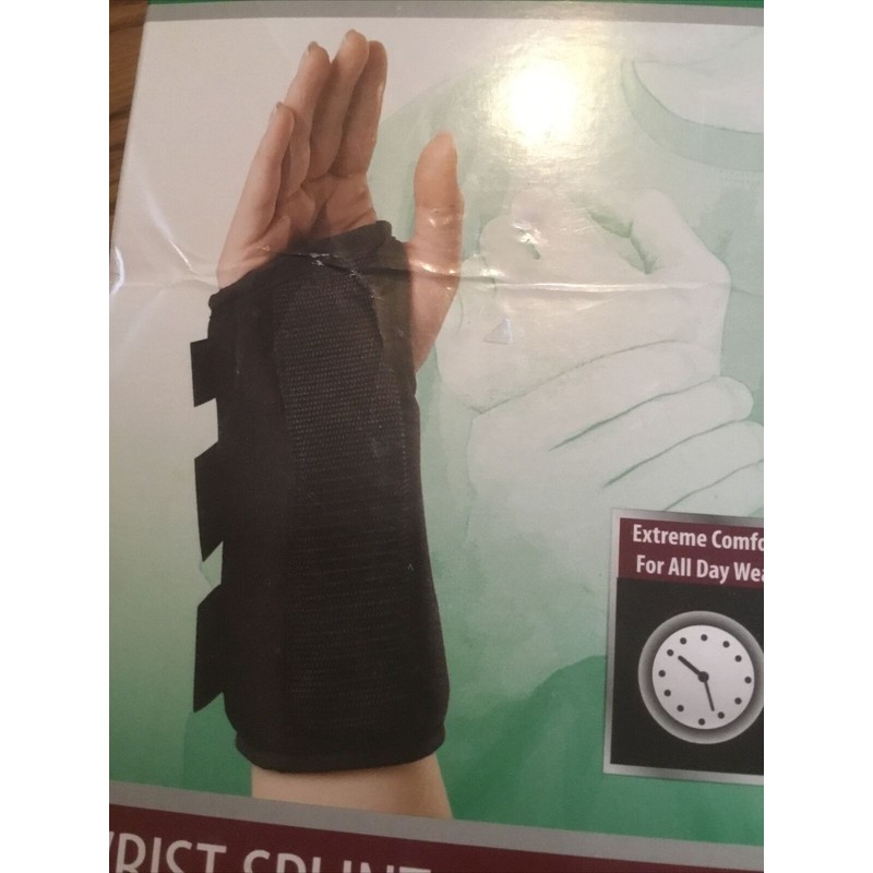Cured Wrist Splint Right Large. This is a new splint but the box may have some tears. The pictures are of one of sixty-seven of the splints I have for sale so you may not get the one pictured, but will get the exact same brand and style of splint. This has a metal stay so for not moving the wrist. This splint is a size small and is for the left wrist. This is used for carpal tunnel, tendon it is, and mild sprains or strains. Thanks for looking!