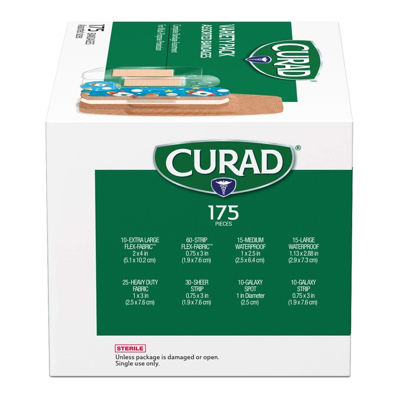 CURAD® Family Variety Pack Bandages provide a complete bandage assortment to keep you covered for any first aid injury. To tackle every type of at-home need, this pack includes 5 different bandage styles that come in various sizes and shapes. The styles include Waterproof, Galaxy, Flex-Fabric™, and Heavy Duty so everyone in their preferred choice.