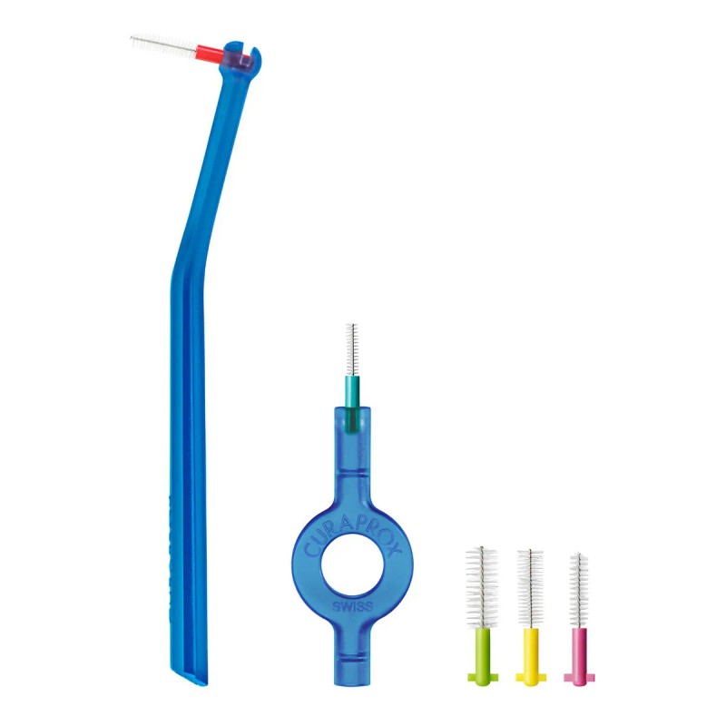 Este kit "Start Mixed" es ideal para quienes comienzan a usar cepillos interdentales o para aquellos que tienen diferentes tamaños de espacios entre sus dientes. Incluye los cepillos más finos del mundo, con diámetros de paso que van desde 0.6 mm (turquesa) hasta 1.1 mm (verde lima), cubriendo una amplia gama de necesidades. La parte central del cepillo, un alambre quirúrgico patentado de CURAL®, es ultra-fino y resistente, permitiendo acceder incluso a los espacios más pequeños sin doblarse ni dañar la encía.