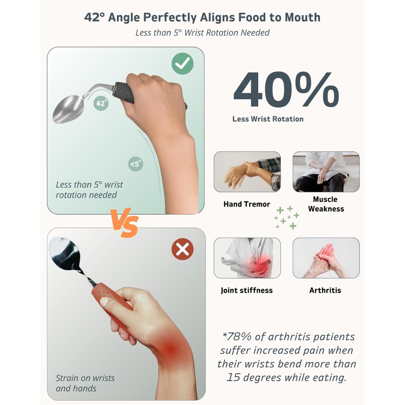 - ERGONOMIC 42° ANGLED DESIGN: Specially engineered angled utensils for individuals with Parkinson's, hand tremors, arthritis, and elderly users. Reduces wrist rotation and fatigue, encouraging independent and comfortable eating.