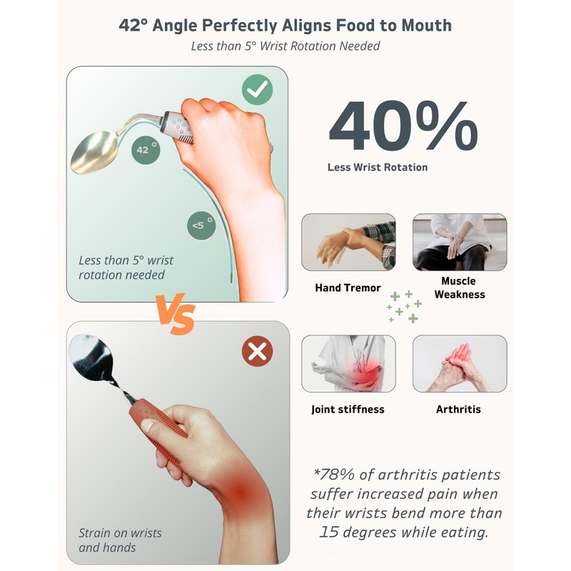 • ERGONOMIC 42° ANGLED DESIGN: Specially engineered angled utensils for individuals with Parkinson's, hand tremors, arthritis, and elderly users. Reduces wrist rotation and fatigue, encouraging independent and comfortable eating.