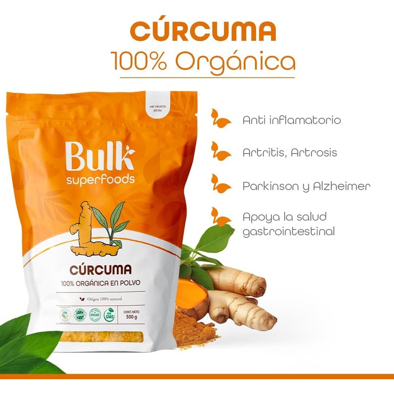 Curcuma en Polvo 100% Natural y Orgánica | Contiene 500g | BULK SUPERFOODS | Organic Turmeric Powder | Premium Natural Food | Superalimento de Alta Calidad