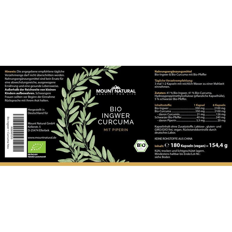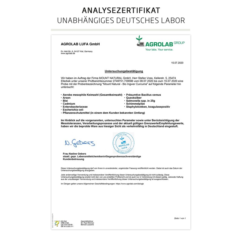 Mount Natural organic turmeric with organic ginger is made in Germany. Each supplier proves the origin and quality of the raw materials in writing. In addition, Mount Natural has each product analyzed for purity by an independent German laboratory.