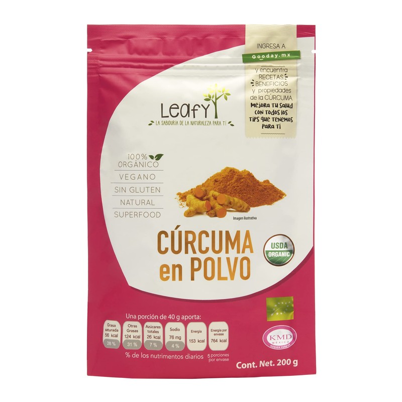 Cúrcuma Orgánica en Polvo 200g, Leafy | Superfood | Vitamina C, E, K | Vegano | Sin rellenos | 100% Cúrcuma | Magnesio, Calcio, Hierro, Potasio, Manganeso, Fósforo y Zinc | Certificación USDA.