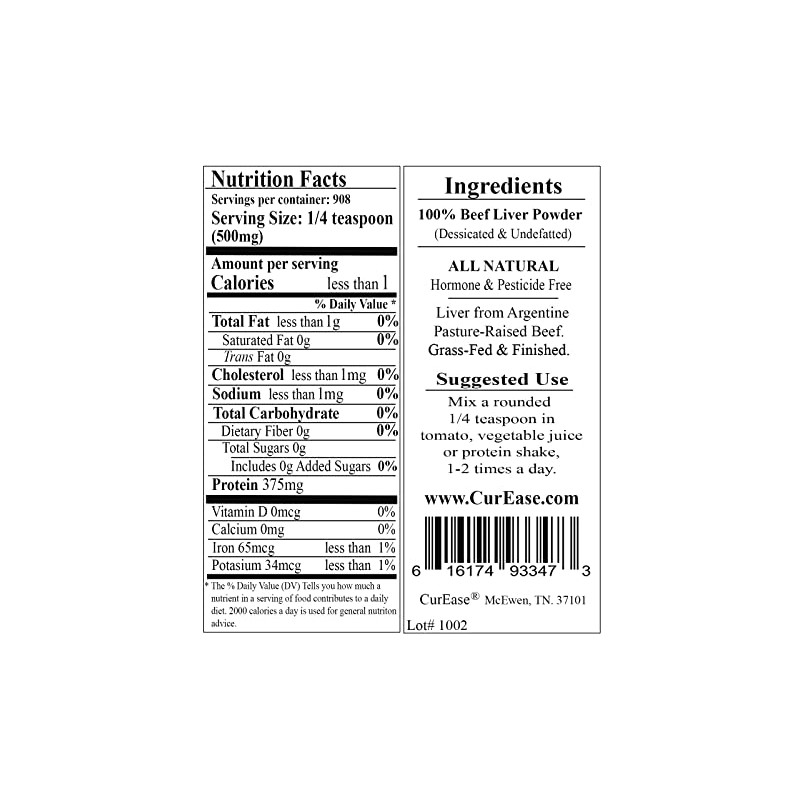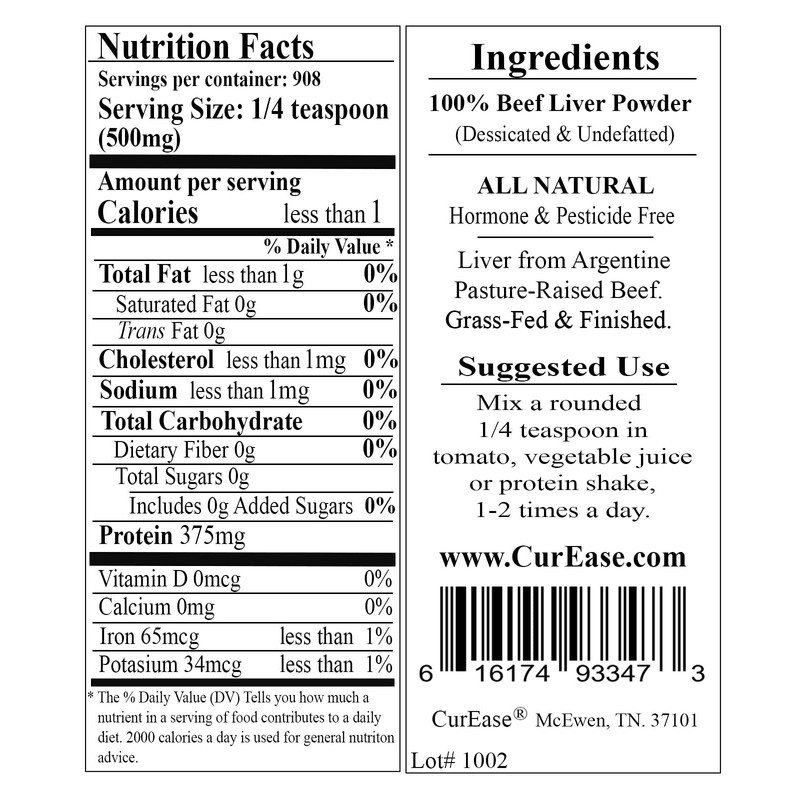 CurEase Argentine Grass Feed Beef Liver Powder Undefatted Desiccated (dried) Pesticide and Hormone Free 1lb One Pound (453grams) 908 Servings