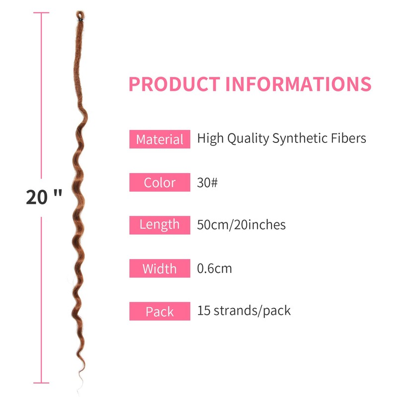 Package List:15 strands curly dreadlocks+1 crochet hook+1 crochet hook+1 pack hair clips+1 pack mini rubber bands