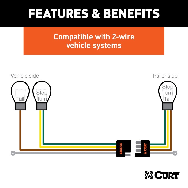 The CURT multi-function taillight converter is a heavy-duty electrical converter for virtually any vehicle-trailer combination It comes with color-coded wires and an easy-to-read wiring guide, as well as a dust cover to protect the 4-way flat connector This package includes a powered converter wiring kit #55152 and four snap locks for faster, more secure splicing..