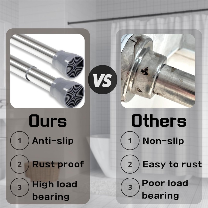- [Durable & Corrosion Resistant, Non-slip and Stable] This shower curtain rod is made of high quality corrosion resistant material with excellent durability and resistance to deformation, rust and abrasion, both ends are equipped with silicone caps for stability and slip resistance, while the high-quality spring ensures excellent tensile strength, which extends the service life and minimizes the risk of sagging or damage over time.