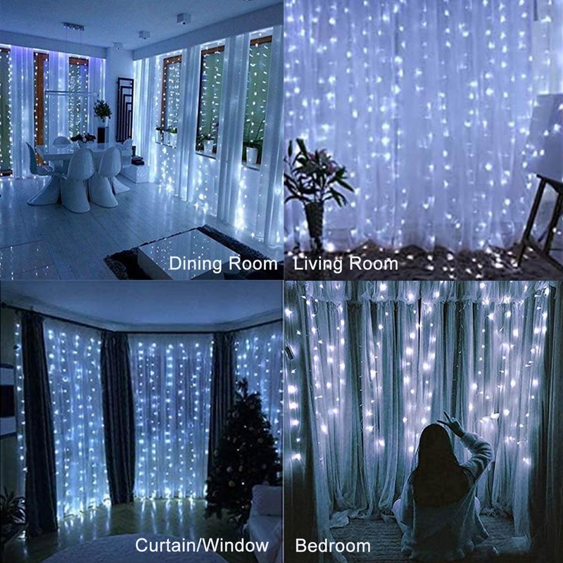 - 【300 LED DECORATION CURTAIN LIGHTS】300pcs super bright flashing lights produce plenty of light volume, dazzling warm and shining glow. The string is made of lightweight copper wire, and the hook on each curtain string is mainly used for hooking curtains, this curtain string light (curtains not included) is perfect for home curtains, walls, and indoor and outdoor decoration. Full accessories and installation at will.
