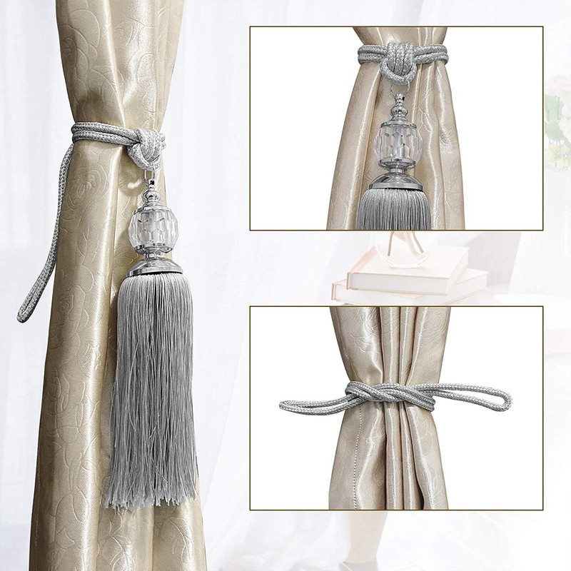 Curtain Tiebacks Rope Tassel TieBacks Curtain Holdbacks Silver for Drapes Decorative Drapery Crystal Holdback Tie Backs Handmade Curtain Holder 2 Pack