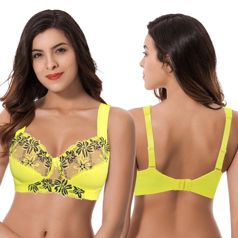 Curve Muse Plus Size Minimizer Unlined Wireless Bra with Lace Embroidery-3Pack-Navy,Yellow,Black-48DD (EU:110E)