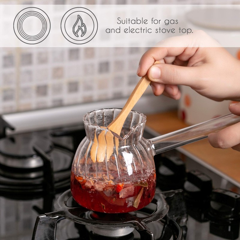 Use this easy-to-clean, extremely heat-resistant glass pot as an alternative to a larger saucepan when you’re warming up milk for a latte, heating butter, quickly reheating coffee or making Turkish Coffee. Please prefer to use low fire