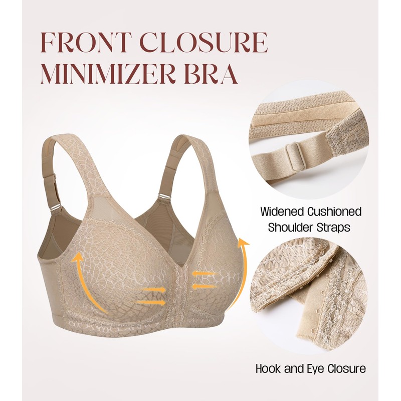 Curyon Minimizer Bras for Women Front Closure Back Support Full Figure Jacquard Beige 36C