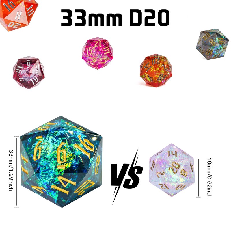 - ♦Mirror Look and Beautiful Coloration♦ Crafted from hand-poured resin, each dice is lovingly hand sanded and mirror-like polished to wonderfully sharp angles and lines, fine edges. This D20 contains holographic foil inclusions with electric hues. The colors are bright and vibrant, and shimmer in your hand as gently turn them.