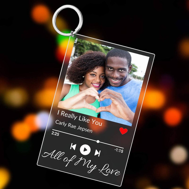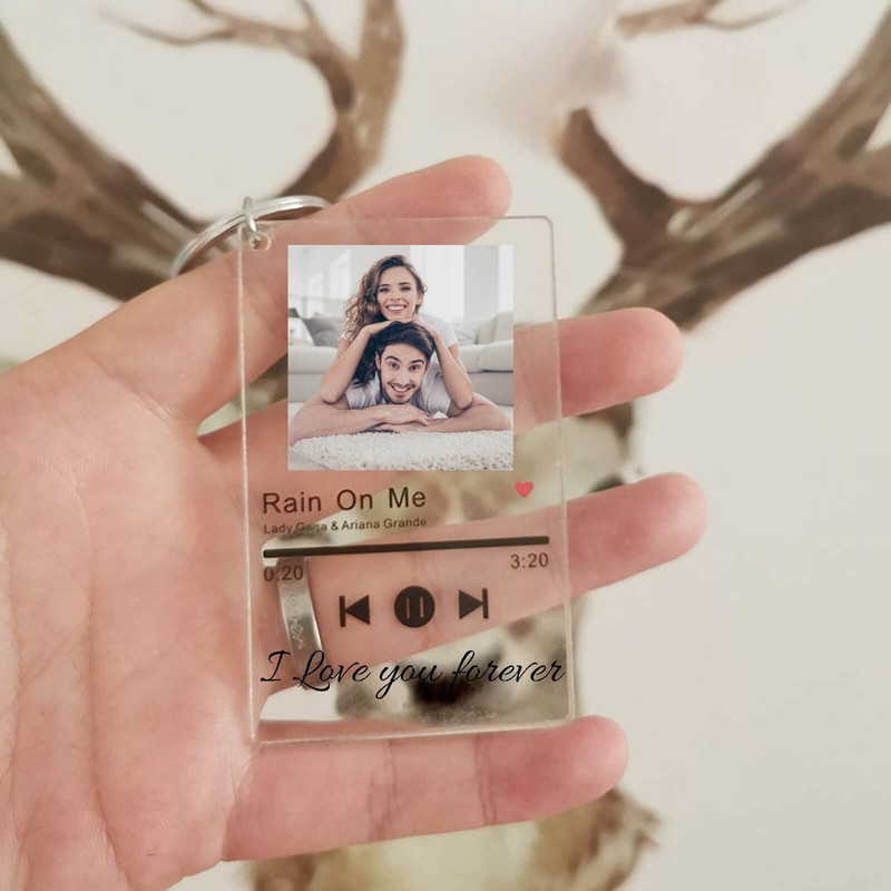 - UNIQUE & EYE-CATCHING. Pair your favorite song with your favorite photo in an eye-catching keychain. Perfectly designed with details from spacing to font selection, your favorite track will be showcased wherever you go. Acrylic finish encasing paired with premium photo paper creates a shimmering keychain.