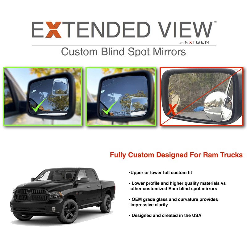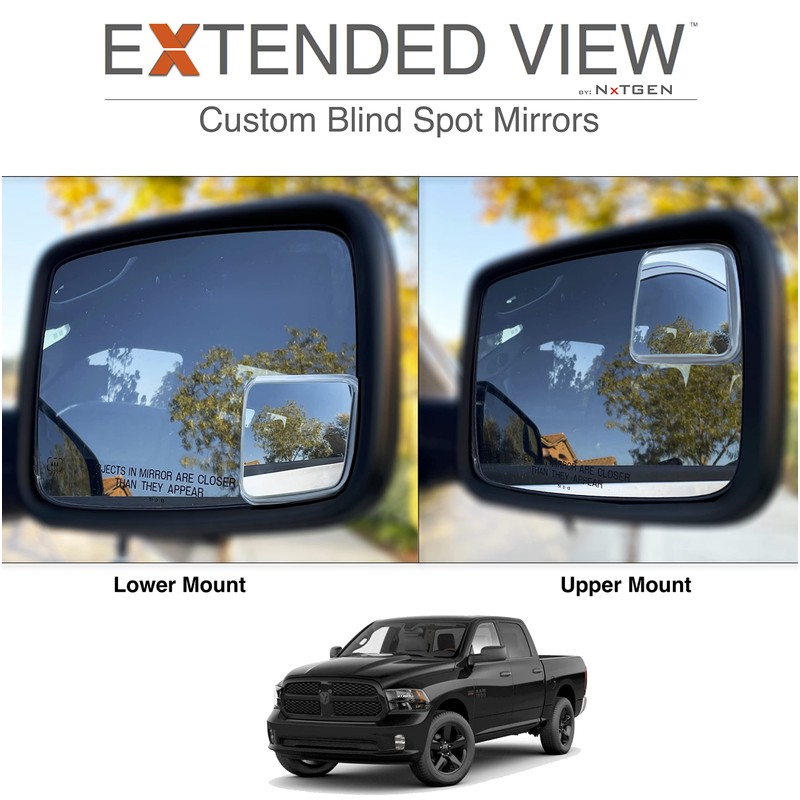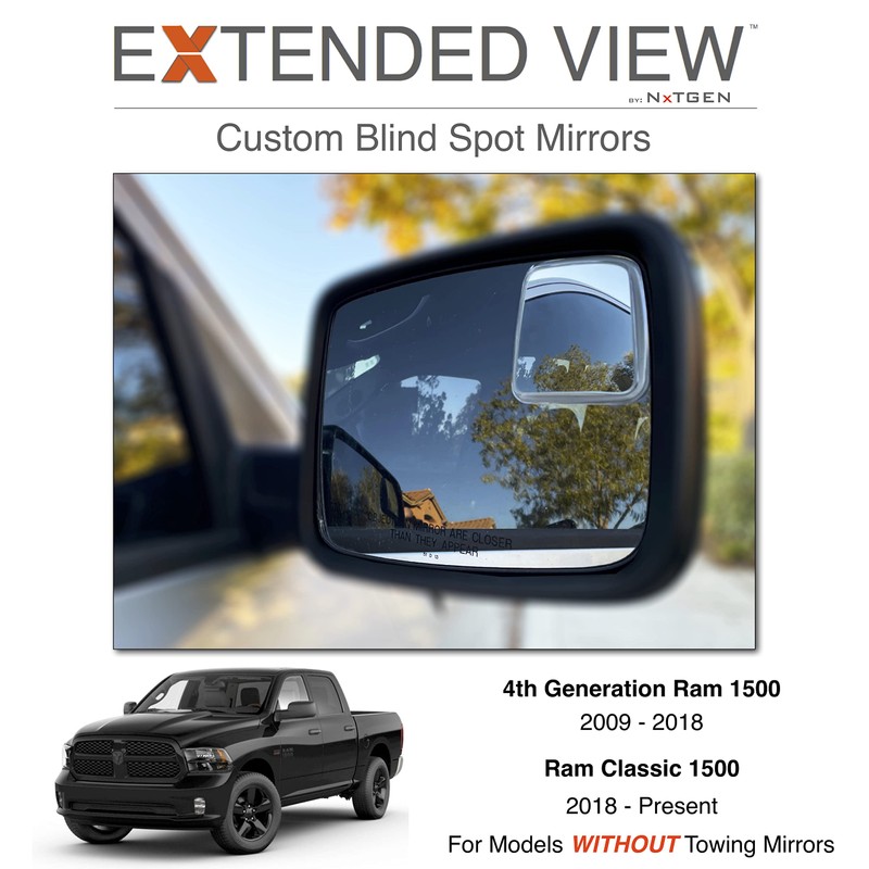 - Extended View blind spot mirrors are custom fit, and compatible with 2009- present 4th Gen Ram 1500. The contour and curvature are customized to work with non-towing mirrors, upper or lower mount.