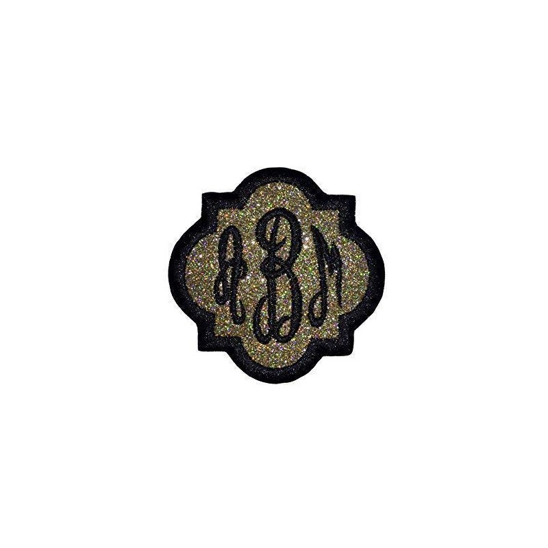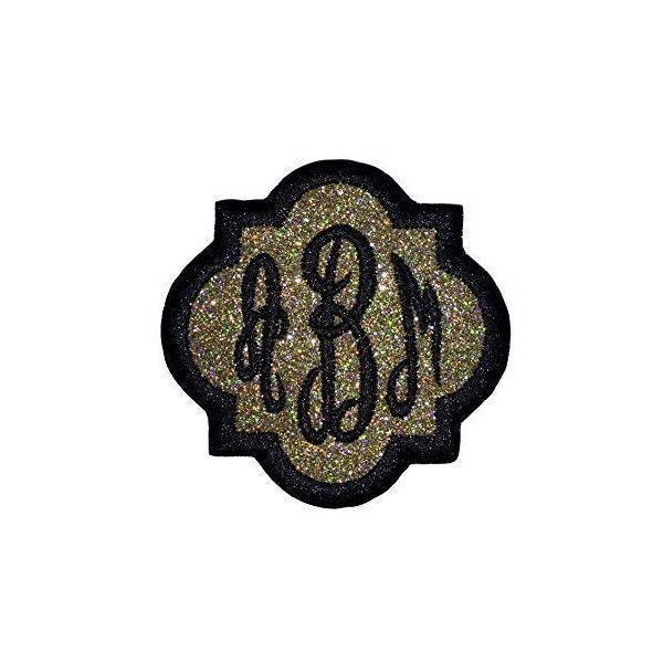 Custom Embroided Name Tag Iron On Patch-Quatrefoil Script Monogram-Gold Glitter/Black Thread