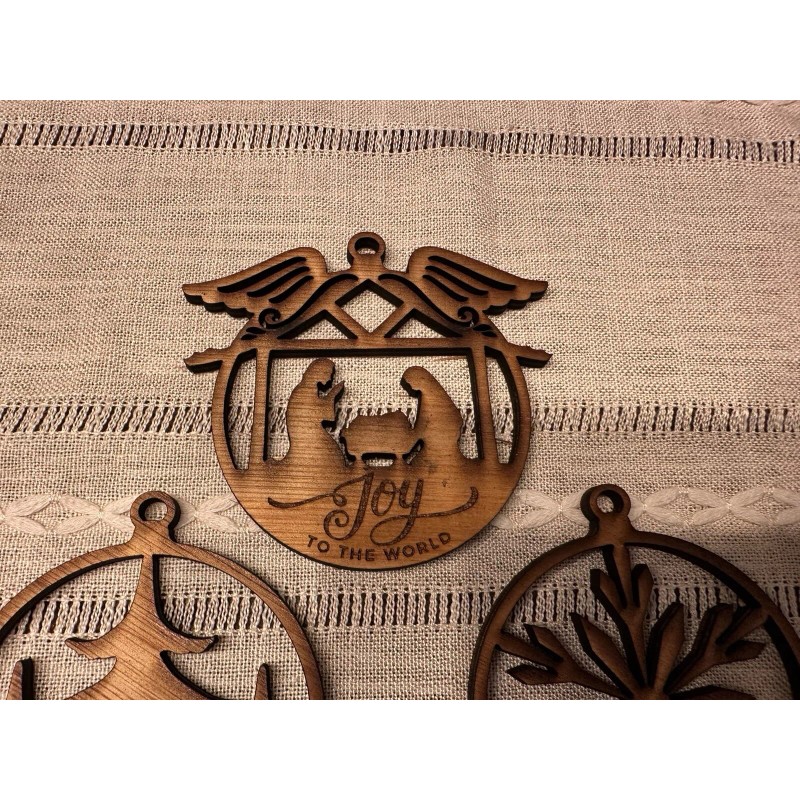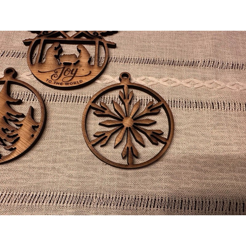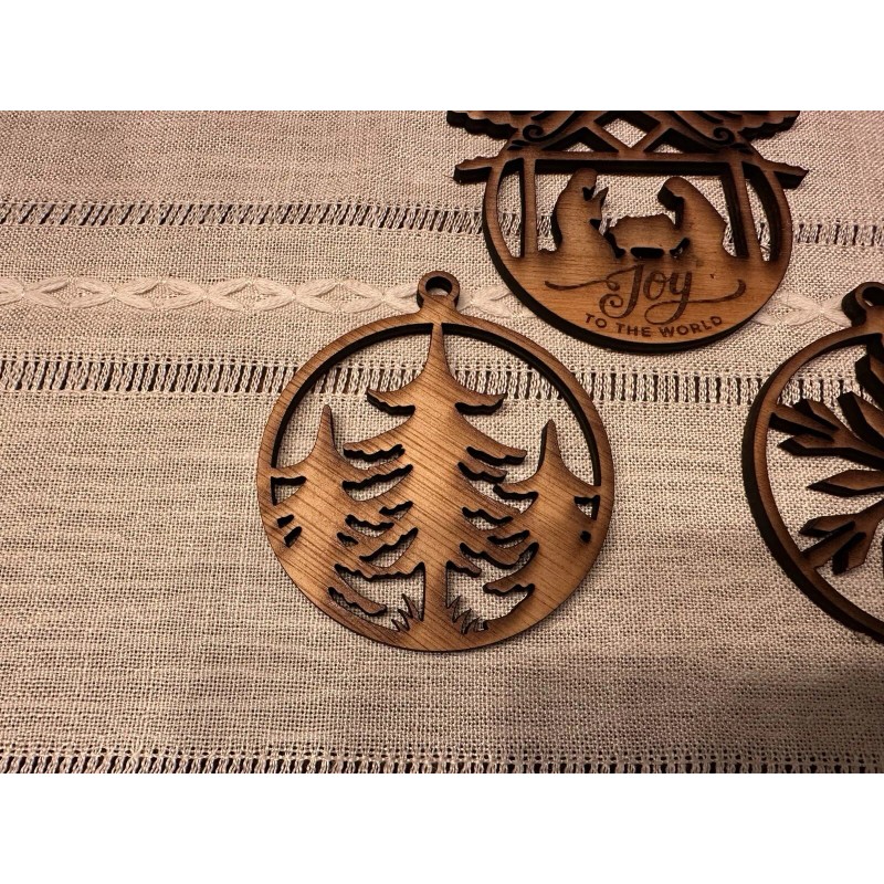 Custom wood cut Christmas ornaments. These are sold in sets of 3. So you’ll get all three pictured.